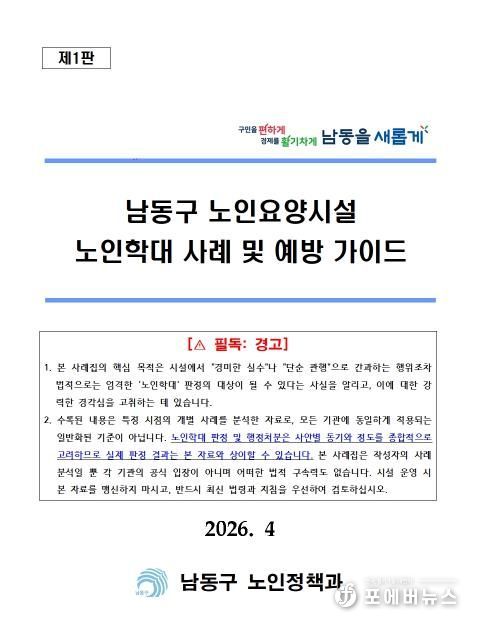 [ 포에버뉴스 김경순 기자 ] 인천시 남동구가 사후 처분 중심의 행정에서 벗어나 현장의 혼란을 선제적으로 해결하는 적극행정의 일환으로 인천시 최초로 ‘남동구 노인요양시설 노인학대 사례 및 예방가이드’를 발간한다고 22일 밝혔다.