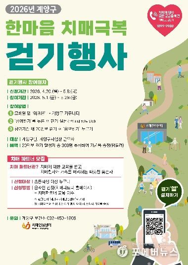 [ 포에버뉴스 김경순 기자 ] 인천광역시 계양구는 구민의 치매 예방과 인식 개선을 위해 5월 1일부터 29일까지 4주간 ‘2026년 계양구 한마음 치매극복 걷기행사’를 개최한다.