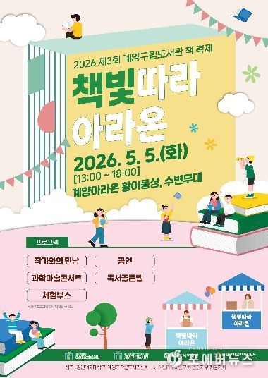 [ 포에버뉴스 김경순 기자 ] (재)인천광역시계양구인재양성장학교육재단 계양구립도서관은 어린이날인 5월 5일 오후 1시부터 6시까지 계양아라온 황어동상 및 수변무대 일원에서 ‘제3회 계양구립도서관 책 축제 '책빛따라 아라온'’을 개최한다고 밝혔다.