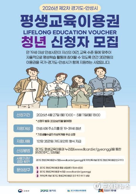 [ 포에버뉴스 김경순 기자 ] 안성시는 시민의 평생학습 참여 기회를 두텁게 보장하기 위해 오는 4월 27일 오전 10시부터 5월 11일 오후 6시까지 ‘2026년 제2차 경기도-안성시 평생교육이용권’ 지원 대상자를 모집한다고 밝혔다.