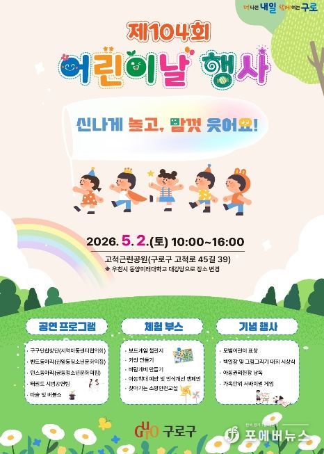 [ 포에버뉴스 김경순 기자 ] 구로구가 제104회 어린이날을 맞아 오는 5월 2일 고척근린공원에서 어린이와 가족, 지역주민이 함께 즐길 수 있는 ‘어린이날 행사’를 개최한다.