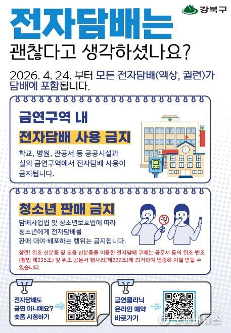 이순희 강북구청장은 “전자담배 역시 금연구역에서 사용할 수 없는 대상이라는 점을 분명히 알리고, 청소년 보호와 간접흡연 예방을 위해 법령 준수가 필요하다”며 “앞으로도 금연 환경 조성과 구민 건강 증진을 위한 정책을 지속적으로 추진하겠다”고 말했다.