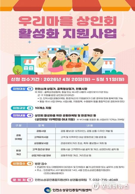 [ 포에버뉴스 김경순 기자 ] 인천광역시는 지역 상권의 자생력 강화와 골목경제 활성화를 위해 ‘2026년 우리마을 상인회 활성화 지원사업’을 본격 추진한다고 밝혔다.