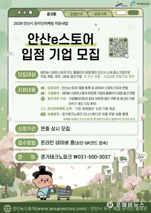 [ 포에버뉴스 김경순 기자 ] 안산시는 관내 중소기업의 판로 확대와 홍보 강화를 위해 안산시 우수 제품 온라인 홍보관 ‘안산e스토어’에 신규 입점할 기업을 모집한다고 23일 밝혔다.