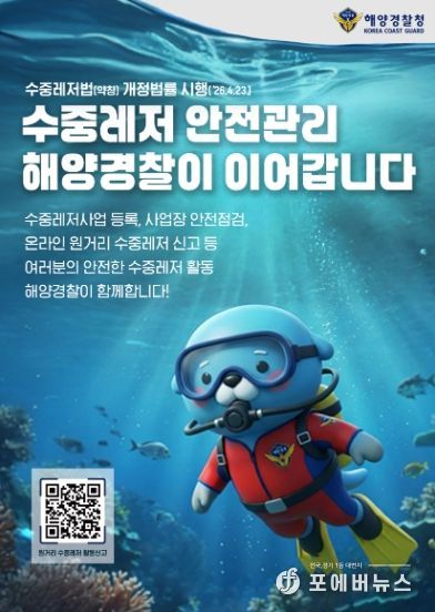 [ 포에버뉴스 김경순 기자 ] 중부지방해양경찰청은 「수중레저활동의 안전 및 활성화 등에 관한 법률」(약칭. 수중레저법)을 시행(4.23.)하며 수중레저 안전관리를 강화한다고 밝혔다.