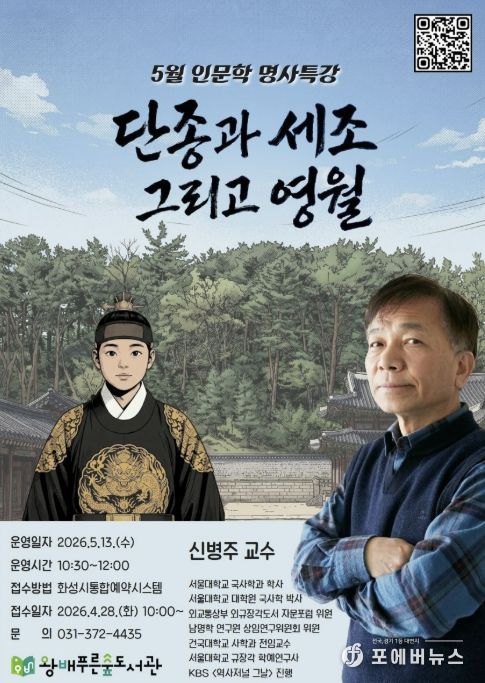 [ 포에버뉴스 김경순 기자 ] 화성시문화관광재단 운영하는 왕배푸른숲도서관이 오는 5월 13일, 지역 주민들을 위해 역사학자 신병주 교수를 초청하여 5월 인문학 명사특강을 개최한다.