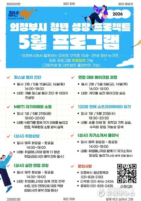 [ 포에버뉴스 김경순 기자 ] 의정부시는 미취업 청년의 취업 준비 역량 강화를 위해 ‘청년성장프로젝트’ 5월 프로그램을 운영한다.