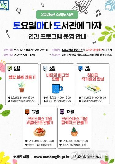 [ 포에버뉴스 김경순 기자 ] 인천시 남동구 소래도서관은 5월부터 12월까지‘2026년 토요일마다 도서관에 가자’행사를 개최한다고 23일 밝혔다.