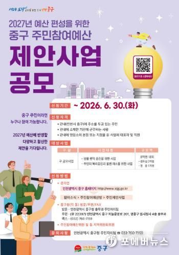 [ 포에버뉴스 김경순 기자 ] 인천시 중구는 ‘2027년도 예산편성을 위한 주민참여예산 제안사업 공모’를 추진한다고 23일 밝혔다.