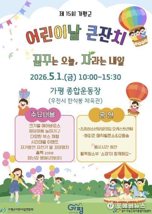 [ 포에버뉴스 김경순 기자 ] 가평군은 오는 5월 1일 오전 10시 가평종합운동장에서 ‘제15회 가평군 어린이날 기념행사’를 개최한다. 가평군어린이집연합회와 가평군육아종합지원센터가 공동 주관하는 이번 축제는 기념행사와 공연, 놀이, 체험 부스 등 다채로운 프로그램으로 꾸며진다.