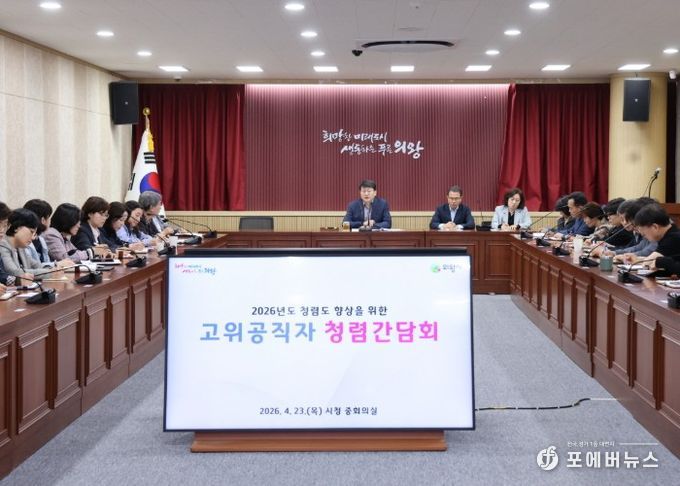 [ 포에버뉴스 김경순 기자 ] 의왕시가 4월 23일 시청 중회의실에서 고위공직자를 대상으로 청렴간담회를 개최하고, 청렴도 향상을 위한 정책 추진 기반 마련에 나섰다.