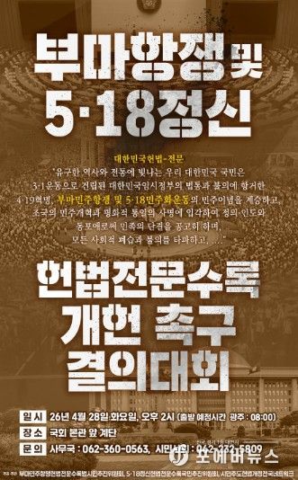 이날 국민결의대회는 5·18정신헌법전문수록국민추진위원회, 부마민주항쟁헌법전문수록범시민추진위원회, 시민주도헌법개정전국네트워크 등 3개 단체가 공동 주최·주관한다.