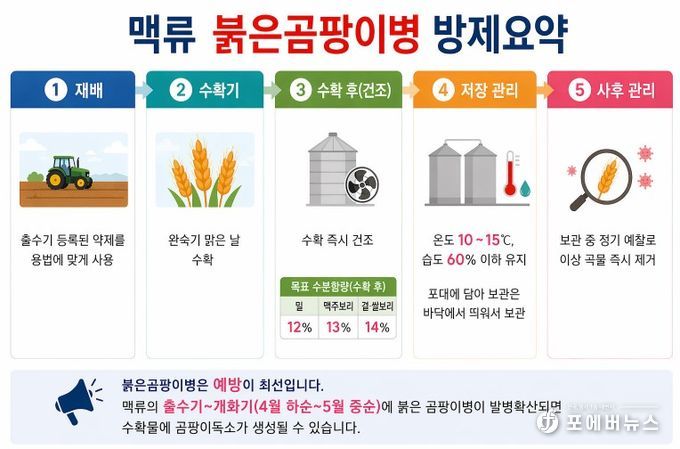 [ 포에버뉴스 김경순 기자 ] 이천시는 맥류의 본격적인 출수기(40%출수) ~ 개화기(출수 후 5~10일)를 맞아 붉은곰팡이병 방제를 당부한다고 전했다. 최근 봄철의 기온상승과 강우량의 상황에 따라서 맥류의 붉은곰팡이병 방제 중요성을 강조했다.