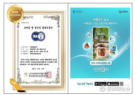 [ 포에버뉴스 김경순 기자 ] 인천광역시(시장 유정복)는 스마트관광 플랫폼 ‘인천e지’ 앱(APP)이 관광약자를 배려한 서비스 구현의 우수성을 인정받아, ‘모바일 앱 접근성 품질인증(Mobile Accessibility)’을 3년 연속 획득했다고 밝혔다.