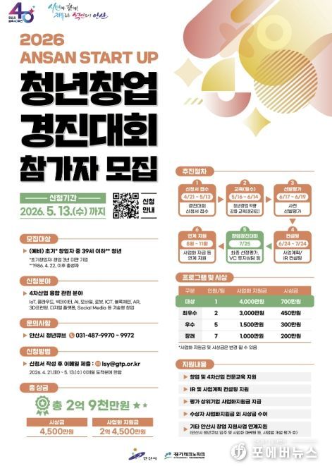 [ 포에버뉴스 김경순 기자 ] 안산시는 창의적인 아이디어를 보유한 청년 창업가를 발굴하기 위해 내달 13일까지 ‘2026 안산 스타트업 청년창업 경진대회’ 참가자를 모집한다고 24일 밝혔다.