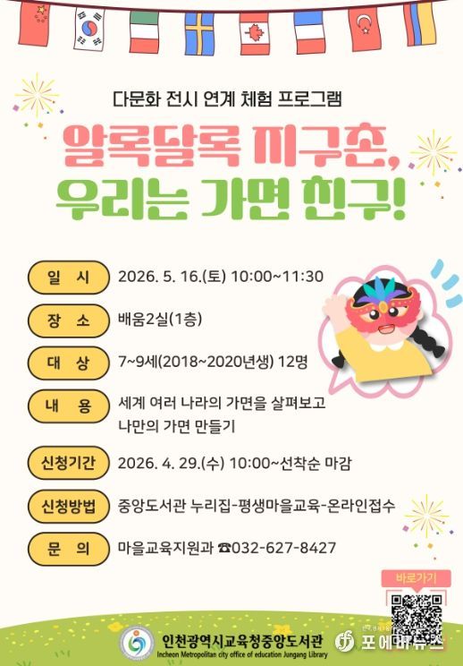[ 포에버뉴스 김경순 기자 ] 인천광역시교육청중앙도서관은 5월 16일 다문화 전시 연계 체험 ‘알록달록 지구촌, 우리는 가면 친구!’를 운영한다.