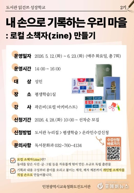 [ 포에버뉴스 김경순 기자 ] 인천광역시교육청화도진도서관은 오는 28일부터 지역의 일상을 기록으로 담아내고 공유하는 시민 참여형 프로그램 ‘내 손으로 기록하는 우리 마을’의 참여자를 모집한다.