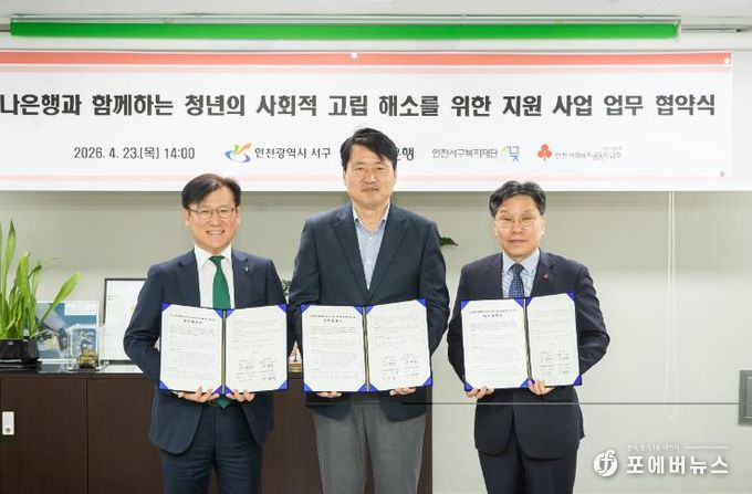 [ 포에버뉴스 김경순 기자 ] 인천 서구는 지난 23일 구금고 지역사회 협력사업인 ‘하나은행과 함께하는 청년의 사회적 고립 해소를 위한 지원 사업’ 추진을 위해 하나은행, 인천서구복지재단, 인천사회복지공동모금회와 함께 업무 협약을 체결했다고 밝혔다.