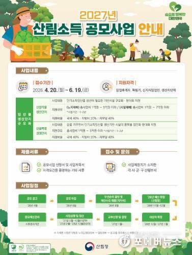 [ 포에버뉴스 오명숙 기자 ] 고흥군은 임산물 생산 기반 확충과 임업 경쟁력 강화를 위해 ‘2027년도 산림소득사업(임산물생산단지 규모화)’ 공모사업 신청을 오는 6월 19일까지 접수한다고 밝혔다.