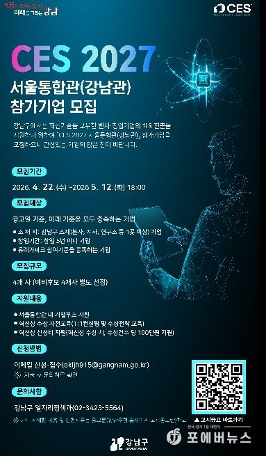 [ 포에버뉴스 김경순 기자 ] 꿈이 모이는 도시, 미래를 그리는 강남구가 세계 최대 IT·전자 전시회인 CES 2027을 무대로 관내 스타트업의 글로벌 진출 지원에 나선다. 강남구는 ‘CES 2027 서울통합관(강남관)’에 참여할 스타트업을 4월 22일부터 5월 12일까지 모집한다.