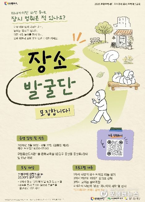 [ 포에버뉴스 김경순 기자 ] 서울 은평구는 다음 달 16일부터 구립증산도서관에서 은평문화재단이 주관하는 2026년 ‘구석구석 동네 문화예술교육’ 지원사업의 일환으로 공모에 선정된 예술교육 프로그램 ‘장소발굴단’을 운영한다고 밝혔다.