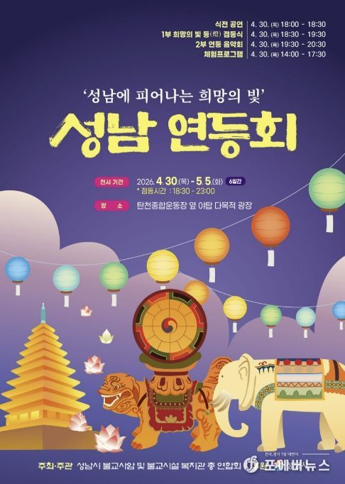 [ 포에버뉴스 김경순 기자 ] ‘2026 성남 연등회’가 오는 4월 30일부터 5월 5일까지 엿새간 분당 탄천 야탑 다목적광장(탄천종합운동장 앞)에서 열린다.
