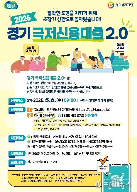 [ 포에버뉴스 김경순 기자 ] 경기도가 5월 6일 오전 9시부터 금융취약계층의 생활 안정을 지원하는 ‘경기 극저신용대출 2.0’ 2차 접수를 시작한다.