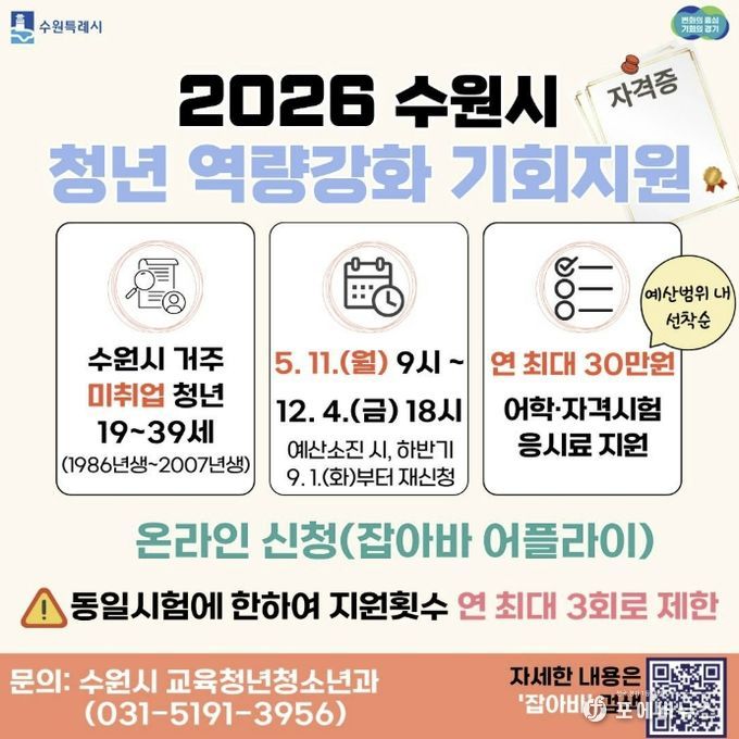 [ 포에버뉴스 김경순 기자 ] 수원특례시는 미취업 청년의 취업 준비 비용 부담을 덜어주는 ‘청년 역량강화 기회 지원 사업’을 12월 4일까지 운영한다. 미취업 청년에게 어학·자격시험 응시료를 1인당 연 최대 30만 원 지원한다.