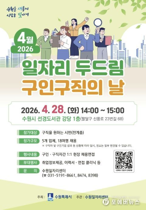 [ 포에버뉴스 김경순 기자 ] 수원특례시는 4월 28일 오후 2시부터 3시까지 선경도서관 강당에서 ‘4월 일자리 두드림 구인·구직의 날’을 개최한다.