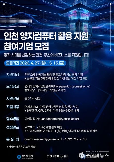 시는 연세대학교와 협력해 ‘2026년 인천 양자컴퓨터 활용 지원사업’에 참여할 기업을 모집한다.