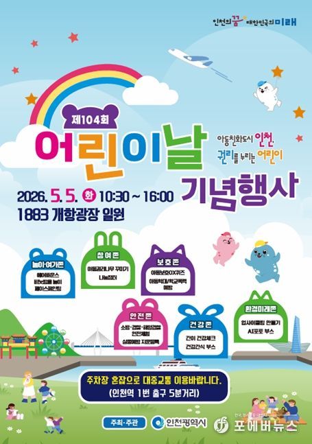 [ 포에버뉴스 김경순 기자 ] 인천광역시는 제104회 어린이날을 맞아 어린이의 권리 존중과 참여 확대를 위한 기념행사를 오는 5월 5일 오전 10시 30분부터 오후 4시까지 중구 북성동 ‘1883 개항광장 일원’에서 개최한다고 밝혔다.