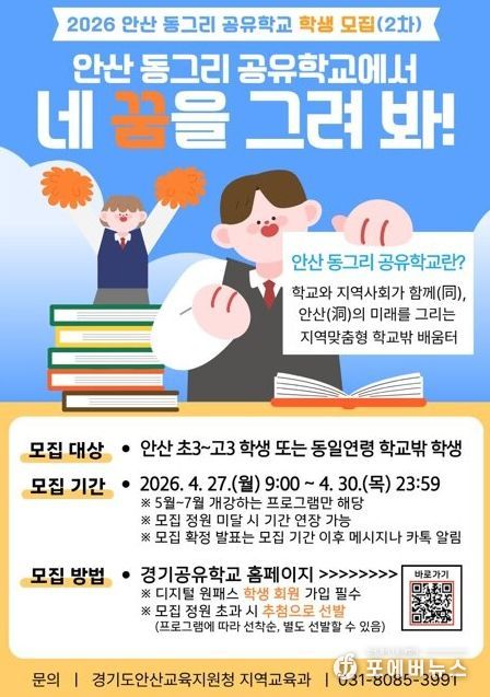 [ 포에버뉴스 김경순 기자 ] 안산시 중앙도서관은 내달부터 안산교육지원청이 추진하는 ‘2026년 안산 동그리 우리동네 도서관 공유학교’ 사업에 참여해 지역 교육 인프라 확충에 나선다고 27일 밝혔다.
