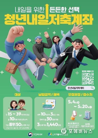 ‘청년내일저축계좌’는 일하는 청년이 3년간 매월 10만 원 이상을 저축하면 정부가 매월 30만 원을 추가로 적립해 주는 사업이다. 만기 시 최대 1,080만 원의 정부 지원금을 받을 수 있다.