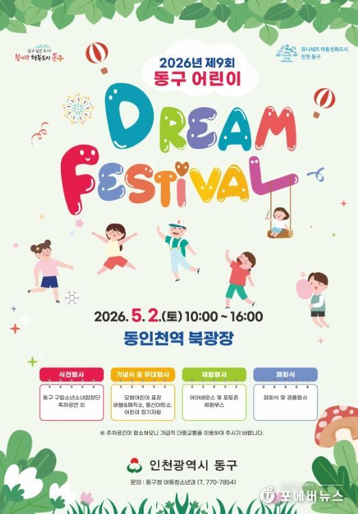 [ 포에버뉴스 김경순 기자 ] 인천 동구는 오는 2일 동인천역 북광장에서 제104회 어린이날을 맞아‘2026년 제9회 동구 어린이 Dream Festival’을 개최한다고 밝혔다.