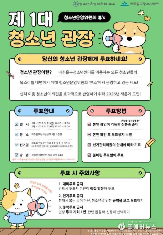 투표는 미추홀구청소년센터 3층 소강당에서 직접 투표 방식으로 이뤄지며, 1차 투표는 5월 22일 16:00~19:30, 2차 투표는 5월 23일 13:00~17:00에 각각 실시된다.