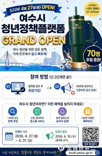 [ 포에버뉴스 오명숙 기자 ] 여수시는 청년들에게 맞춤형 정책 정보를 제공하고 양방향 소통을 지원하기 위한 ‘여수시 청년정책 플랫폼’을 27일 정식 운영 개시하고, 이를 기념한 특별 이벤트를 진행한다고 밝혔다.
