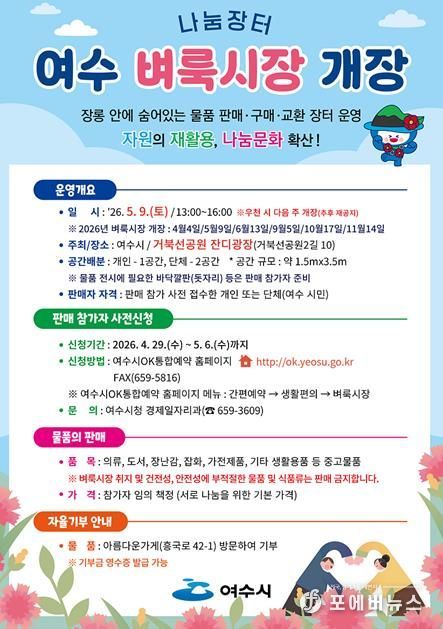 [ 포에버뉴스 오명숙 기자 ] 여수시는 오는 5월 9일 오후 1시부터 4시까지 거북선공원 잔디광장에서 ‘2026년 제2차 여수 벼룩시장’을 개최한다고 밝혔다.