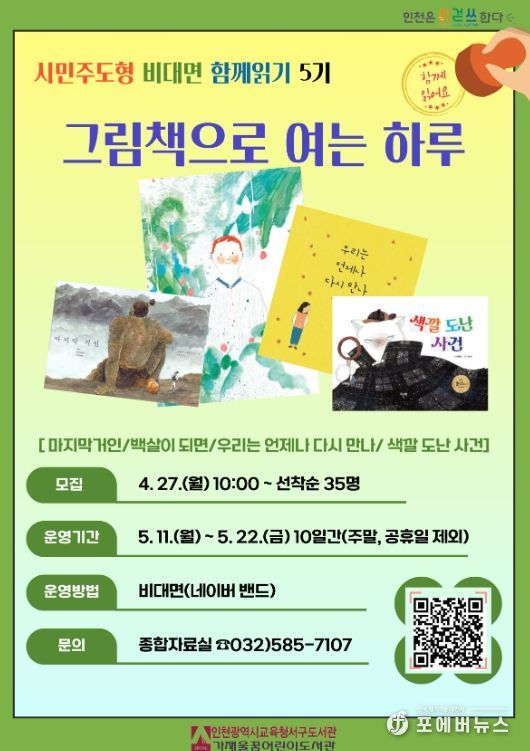 [ 포에버뉴스 김경순 기자 ] 인천광역시교육청서구도서관(관장 정연순)은 2026년 시민주도형 비대면 함께읽기 5기로, 5월 11일부터 5월 22일까지 ‘그림책으로 여는 하루’ 프로그램을 운영한다.