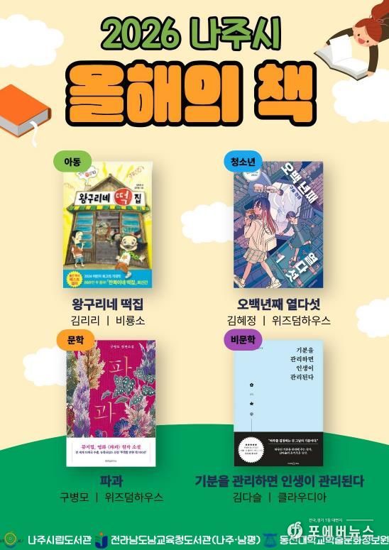 2026년 나주시 올해의 책으로 최종 선정된 도서는 어린이 분야 ‘왕구리네 떡집’(김리리), 청소년 분야 ‘오백년째 열다섯’(김혜정), 일반문학 분야 ‘파과’(구병모), 일반 비문학 분야 ‘기분을 관리하면 인생이 관리된다’(김다슬)이다.