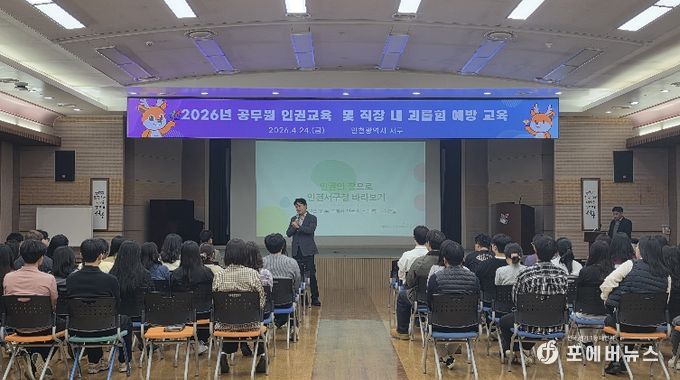 [ 포에버뉴스 김경순 기자 ] 인천 서구는 지난 24일 총 2회에 걸쳐 서구청 전 직원을 대상으로 ‘2026년 인권교육 및 직장 내 괴롭힘 예방교육’을 실시했다고 밝혔다.