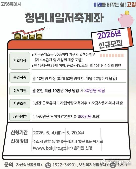 [ 포에버뉴스 김경순 기자 ] 고양특례시는 5월 4일부터 시작하는 청년내일저축계좌 신규 가입자 모집을 앞두고, 가입 독려에 나섰다.