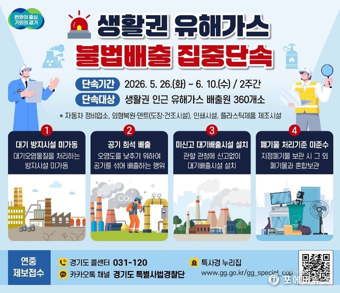 [ 포에버뉴스 김경순 기자 ] 경기도 특별사법경찰단이 5월 26일부터 6월 10일까지 2주간 주거지·학교·병원 등 생활권 인근 지역의 유해가스 배출 사업장을 대상으로 불법행위를 집중단속 한다.