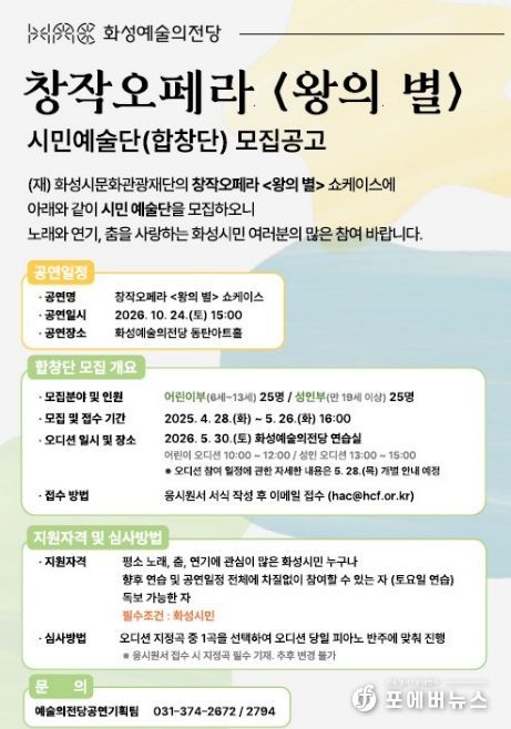 [ 포에버뉴스 김경순 기자 ] (재)화성시문화관광재단은 오는 10월 개최 예정인 창작오페라 '왕의 별' 쇼케이스 무대에 참여할 시민합창단을 모집한다.