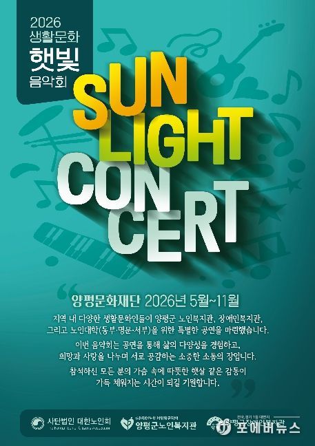[ 포에버뉴스 김경순 기자 ] (재)양평문화재단은 관내 문화 예술 향유 기회를 확대하기 위해 찾아가는 음악회 ‘2026 햇빛 음악회’를 오는 5월 8일부터 본격적으로 운영한다고 밝혔다.