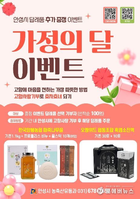 [ 포에버뉴스 김경순 기자 ] 안성시는 오이데이와 5월 가정의 달을 맞아 고향사랑기부제 참여 확대와 지역 농산물 소비 촉진을 위해 ‘오이데이 이벤트’와 ‘가정의 달 이벤트’를 추진한다고 밝혔다.