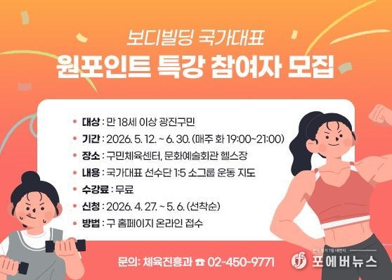 [ 포에버뉴스 김경순 기자 ] 광진구가 구민의 건강한 여가생활과 생활체육 활성화를 위해 ‘국가대표와 함께하는 원포인트 특강’을 운영한다.