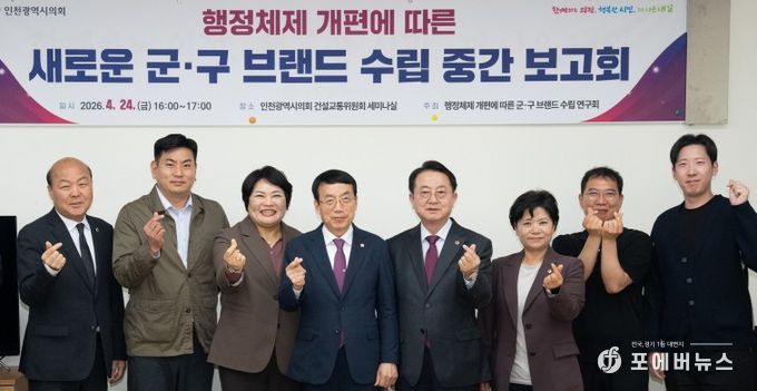 [ 포에버뉴스 김경순 기자 ] 인천광역시의회 ‘행정체제 개편에 따른 군·구 브랜드 수립 연구회(대표의원 허식)’는 최근 시의회 건설교통위원회 세미나실에서 새로운 군ㆍ구 브랜드 수립을 위한 연구용역 중간보고회를 개최했다고 28일 밝혔다.