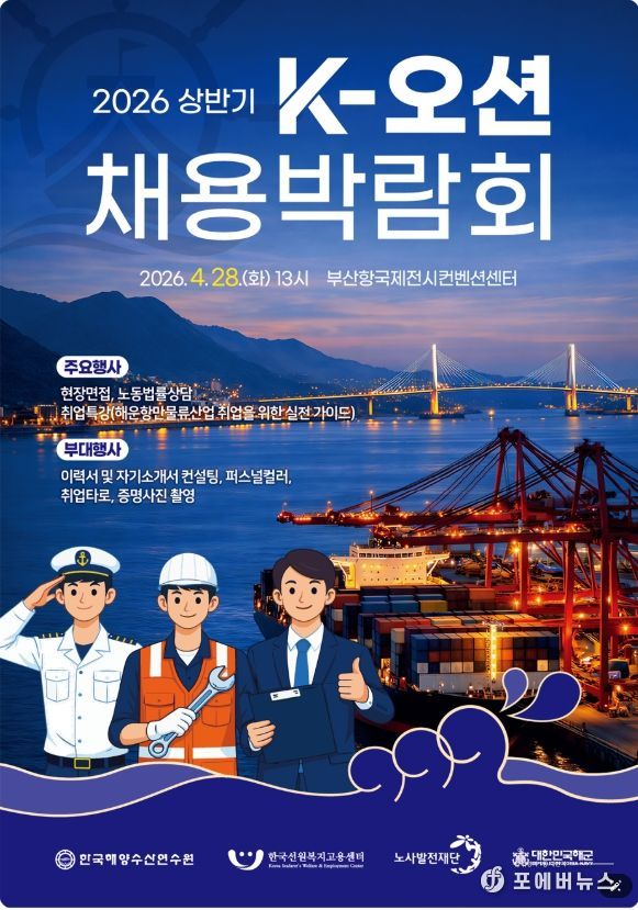 [ 포에버뉴스 사공선 기자 ] 노사발전재단(사무총장 박종필)은 4월 28일 부산항국제전시컨벤션센터 5층 이벤트홀에서 해운·항만물류 산업 공동채용박람회인'2026년 상반기 K-오션 채용박람회'를 개최했다.