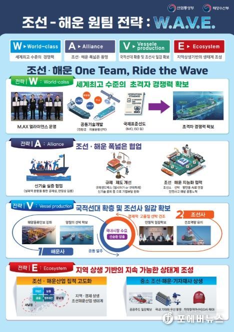 W.A.V.E. 전략은 ❶‘W(World Top Class)’ : 세계 최고 수준의 초격차 기술을 확보하고, ❷‘A(Alliance)’ : 조선・해운 전반에 폭넓은 산업연계 동맹을 구성하고, ❸’V(Vessel production)’ : 국적 선대 확충과 국내조선사 일감 확보로, ❹‘E(Ecosystem)’ : 지역경제 기반의 상생혁신 생태계를 구축한다는 조선-해운 상생발전의 비전을 의미한다.