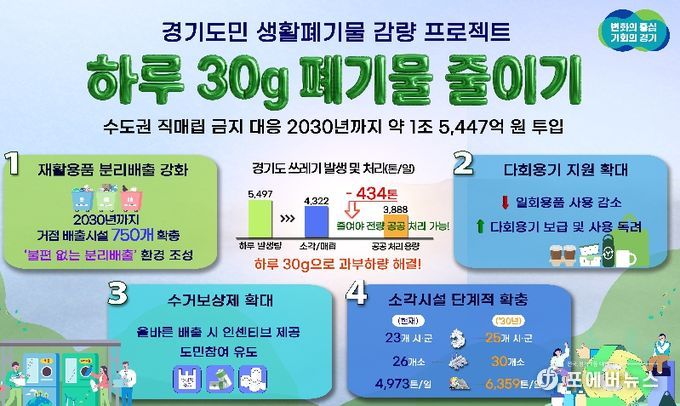 [ 포에버뉴스 김경순 기자 ] 수도권 직매립 금지에 따른 생활쓰레기 감량을 위해 경기도가 2030년까지 5년간 약 1조 5,447억 원을 투입하는 ‘하루 30g, 도민실천형 생활폐기물 감량 프로젝트’를 추진한다.